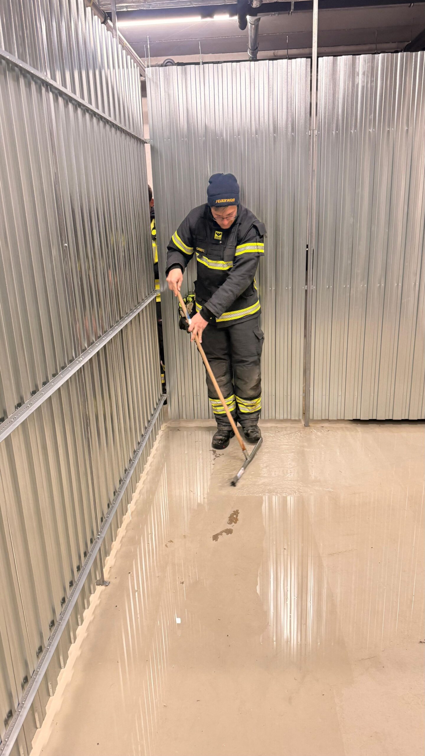 Mittels Abschiebern sowie dem Einsatz eines Nasssaugers wurde das Wasser über einen längeren Zeitraum aufgenommen und abgepumpt. Anschließend wurde der betroffene Bereich schrittweise trockengelegt.