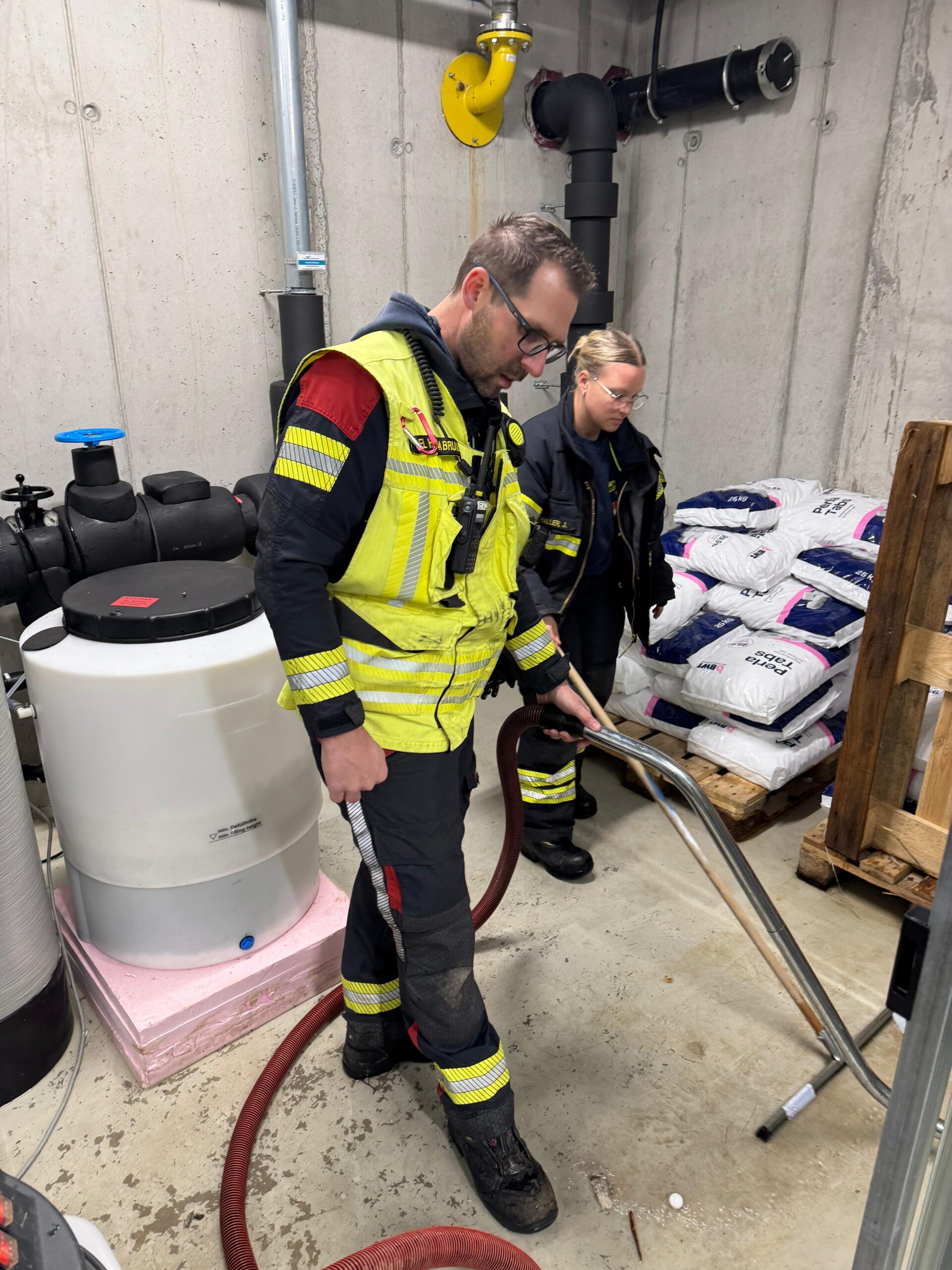 Aufgrund eines technischen Defekts an einer Wasserenthärtungsanlage kam es zu einem größeren Wasseraustritt, wodurch das Kellergeschoss bereits beim Eintreffen der Einsatzkräfte teilweise unter Wasser stand.
