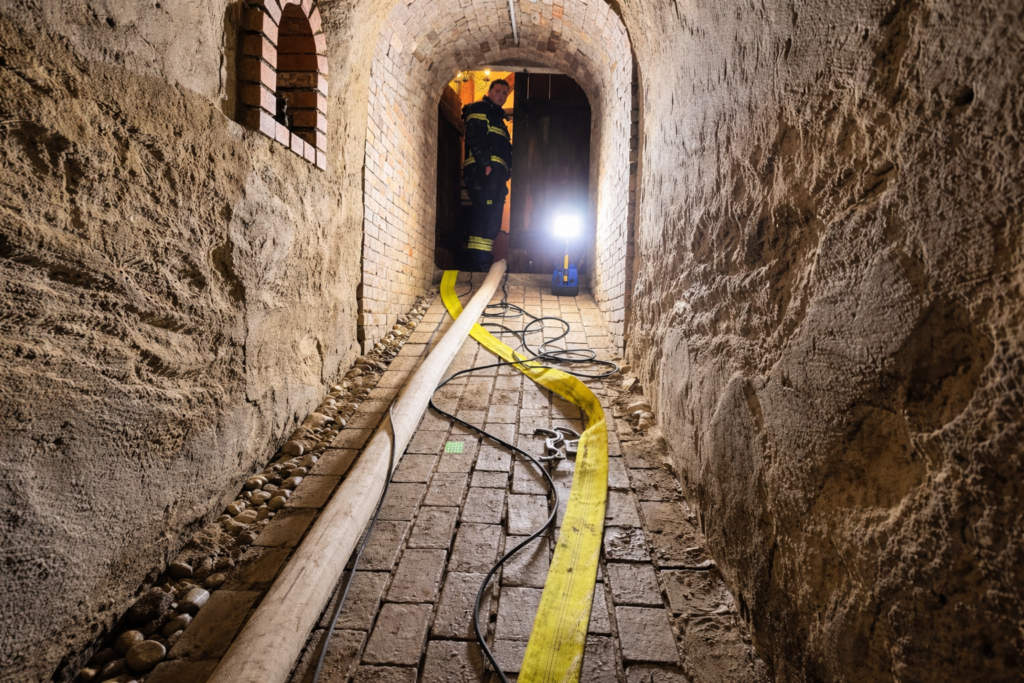 Mittels Unterwasserpumpe (UWP) wurde das eingedrungene Wasser abgepumpt und der betroffene Bereich freigemacht. Nach abschließender Kontrolle konnte der Einsatz beendet werden.